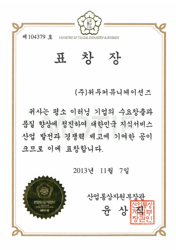 이러닝 기업의 수요 창출과 품질 향상 페이지 정보 작성자 WeDu 댓글 0건 조회 5,641회 작성일 19-05-30 19:32 본문 2013-11-07 표창장 제 104379호 이러닝 기업의 수요 창출과 품질 향상 산업통상자원부장관 윤상직 List Previous한국여성벤처협회 표창장 19.05.30 Next이러닝 콘텐츠 품질 인증 우수 심사 19.05.30