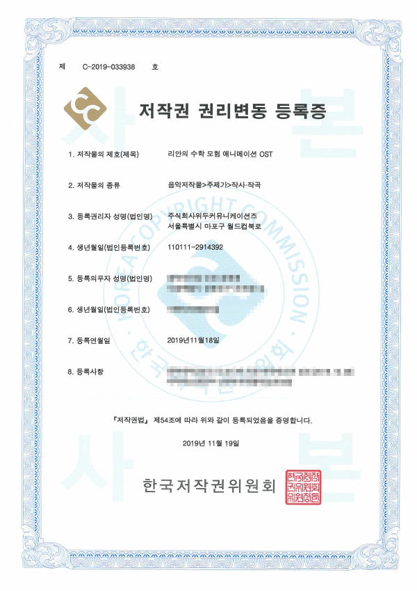 [한국/저작권] 리안의 수학 모험 애니메이션 OST 페이지 정보 작성자 WeDu 댓글 0건 조회 6,359회 작성일 19-11-25 13:54 본문 2019-11-18 저작권 C-2019-033938 음악저작물>주제가>작사·작곡 List Previous[한국/저작권] 리안의 수학 모험 여정의 시작 1,2,3,4,5 21.12.31 Next[한국/저작권] 애니메이션 리안의 수학 모험 19.11.25