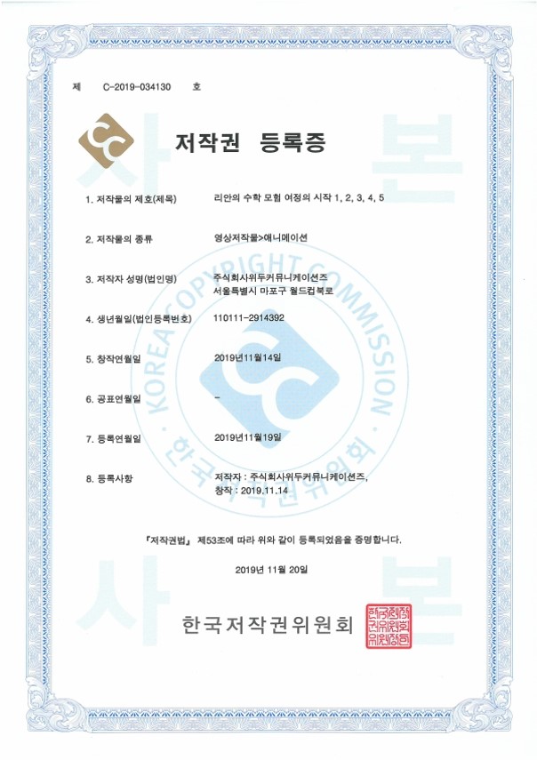 [한국/저작권] 리안의 수학 모험 여정의 시작 1,2,3,4,5 페이지 정보 작성자 WeDu 댓글 0건 조회 5,724회 작성일 21-12-31 12:36 본문 2019-11-20 저작권 C-2019-034130 영상저작물>애니메이션 List Previous[한국/저작권] OLL KIDS/MATH 21.12.31 Next[한국/저작권] 리안의 수학 모험 애니메이션 OST 19.11.25
