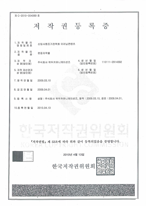 [한국/저작권] 신입사원조기전력화 이러닝 콘텐츠 페이지 정보 작성자 WeDu 댓글 0건 조회 5,918회 작성일 19-05-30 19:01 본문 2010-04-13 저작권 C-2010-004069 신입사원조기전력화 이러닝콘텐츠 / 편집저작물 List Previous[한국/저작권] 리안의 수학 모험 19.05.30 Next[한국/상표] OLL 41류 19.05.30